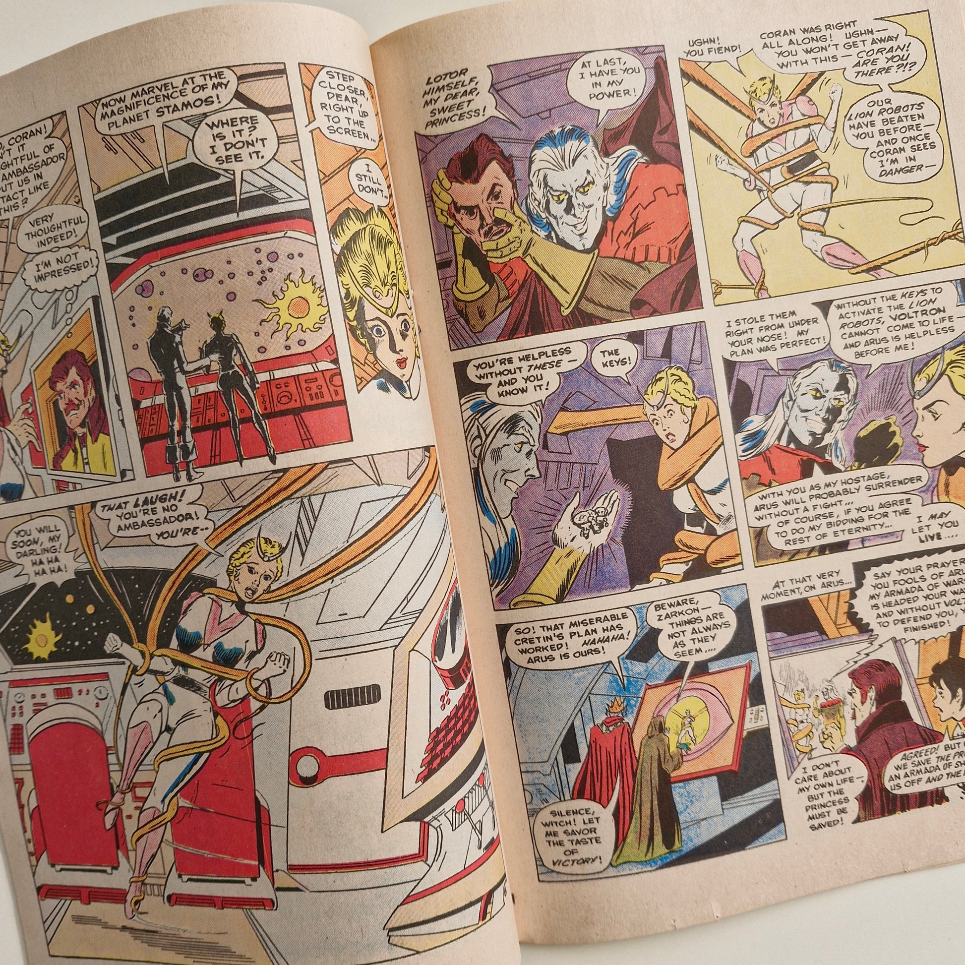 Written by Mark Lerber. Art by Dick Ayers. When an Ambassador from another world visits planet Arus. But when Princess Allura leaves with him his true sinister nature is revealed. Without the pilot of the Blue Lion Voltron cannot be formed! Can the Voltron Force rescue Allura in time to save planet Arus from the looming fleet of Zarkon, or is this the end of Voltron, Defender of the Universe?